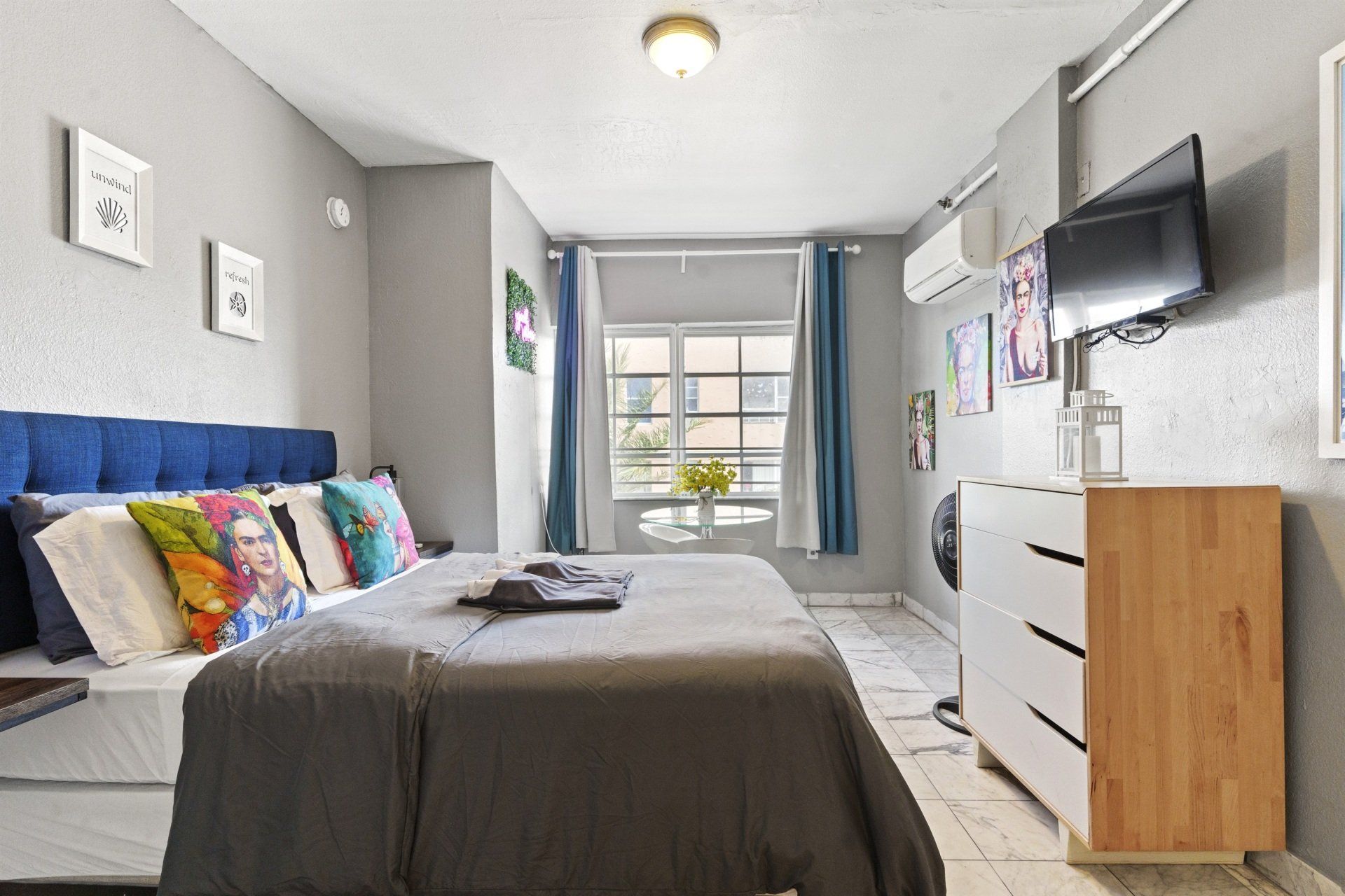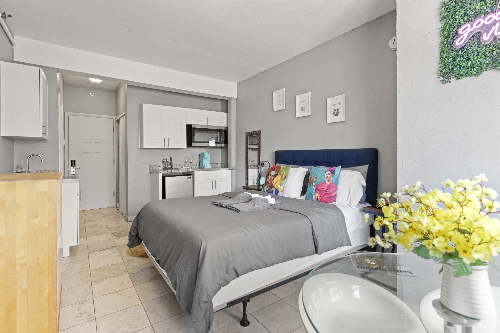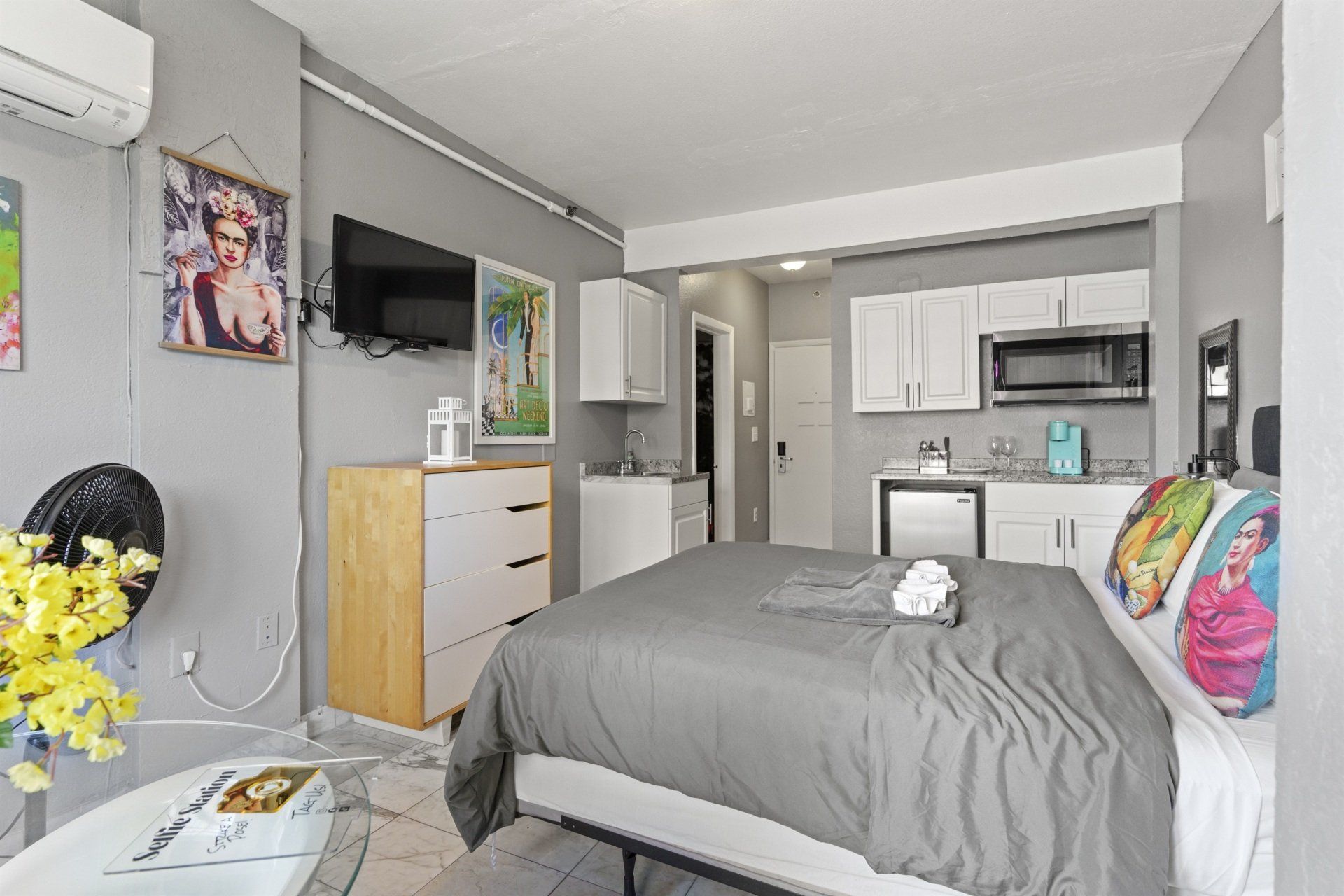 Ocean Living! Steps to the most beautiful beaches in the world. Enjoy this sparkling clean, newly renovated unit- 3 easy blocks to the beach. Blocks to the desirable South Of Fifth area. This suite offers so much value- a private and quiet accommodation for vacationers and business travelers. The unit features a comfortable queen bed, full closet, hangers, a smart TV, strong WiFI. This boutique hotel also has a large solarium area to sunbath, or to get work done with fresh ocean air.